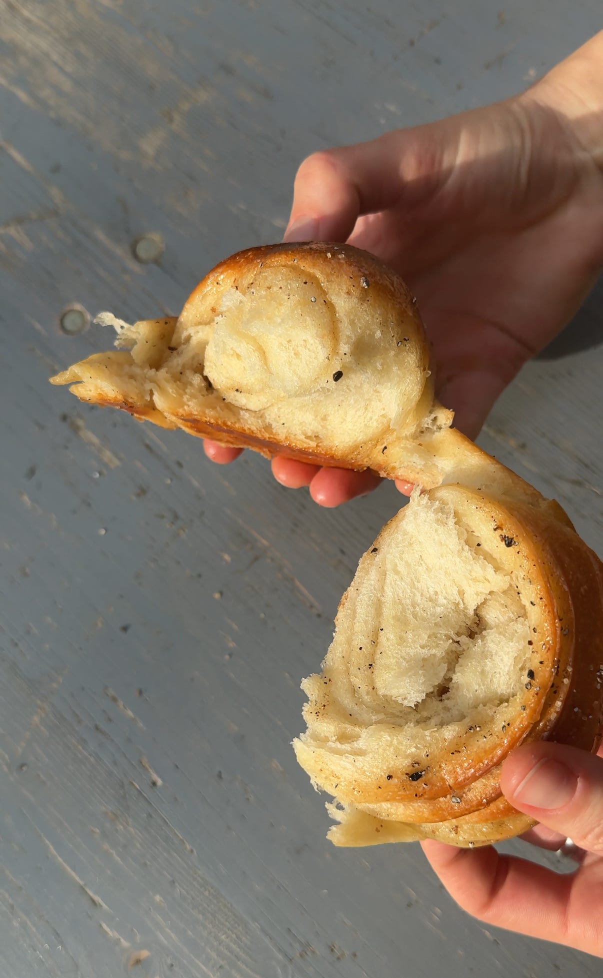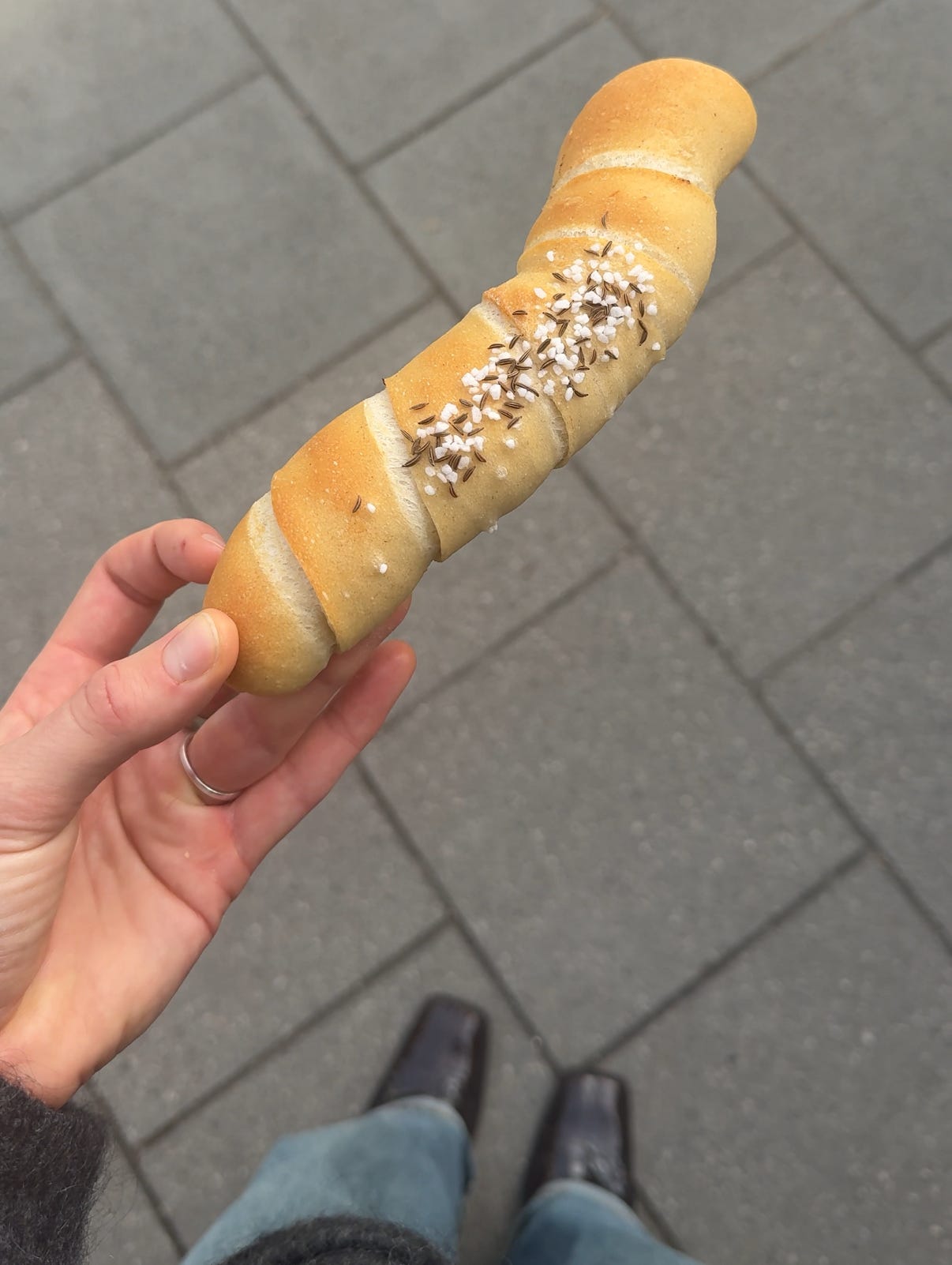 This to me, looks a lot like the korean salt bread that is all over instagram (or just my niched down recommendations). It’s soft and crunchy yeasted dough, handrolled into a long log and topped with whole caraway seeds and salt. This is something that’s really german and you can casually grab to go wherever you are when in need of a little carby situation!